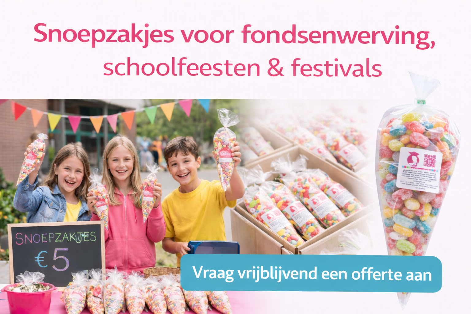 Een succesvolle snoepverkoop voor een schoolfeest begint met een product dat eenvoudig, herkenbaar en aantrekkelijk is voor een breed publiek. Snoepzakjes zijn daarvoor de perfecte keuze: ze zijn betaalbaar, meteen klaar voor verkoop en populair bij zowel kinderen als ouders. Door te kiezen voor een vast product vermijd je keuzestress en blijft de organisatie overzichtelijk.