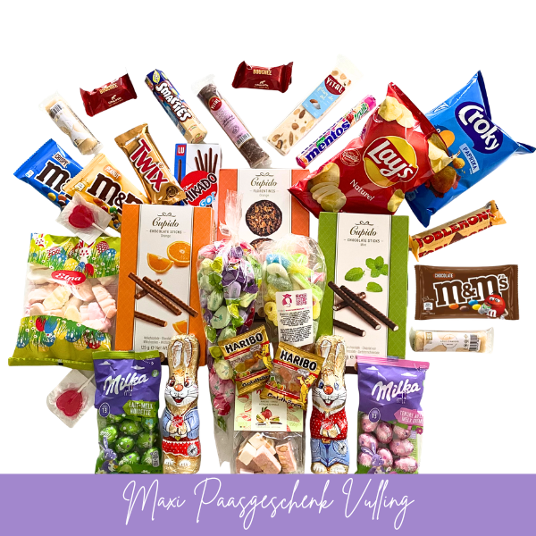 Inhoud: Mint sticks, orange sticks, florentines, paashazen, Milka paaseitjes, chocolade sticks, chips zout en paprika, fruittoffees, zakjes snoep, smarties, mentos, m&m's, twix, nougat, marsepein, bouche, Buche coco, toblerone, Mikado, loll ...Meer informatie