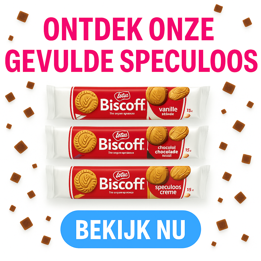 - Lotus gevulde speculoos – traditionele speculooskoekjes met een zachte, zoete vulling. Ideaal bij warme dranken, in lunchboxen of als kleine dagelijkse traktatie.