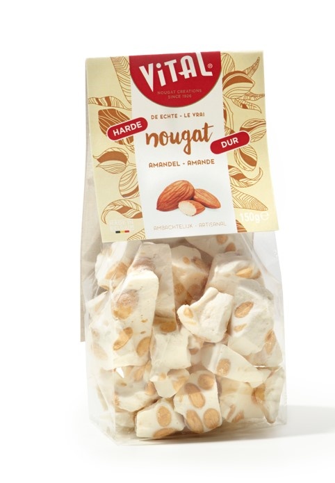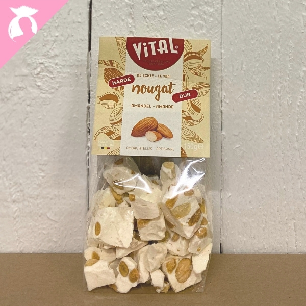 In dit mooie zakje zit 150 gram nougat hard van het merk Nougat Vital. De harde nougat zelf wordt gemaakt van amandelnoten, een vleugje zoete honing en een beetje vanille.