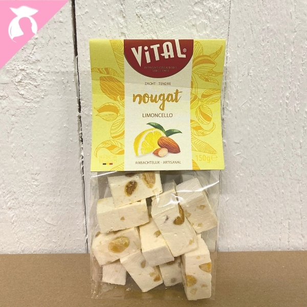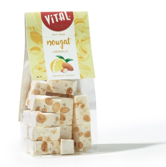 Dit zakje nougat met limoncello smaak is geproduceerd en verpakt door het merk Nougat Vital bekende van nougat, büche coco ,.. echte top producten dus.