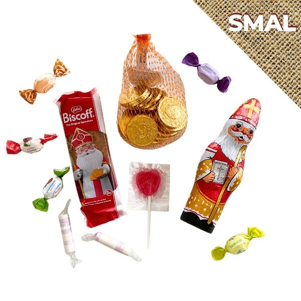 Vier de komst van de Sint en zijn pieten op een originele en zorgeloze manier met een gevulde Sinterklaas jute zakje. Deze klassieke jute zakjes, gevuld met een mix van koek, chocolade en snoep, zijn een sfeervolle traktatie die meteen de magie van Sinterklaas oproept.