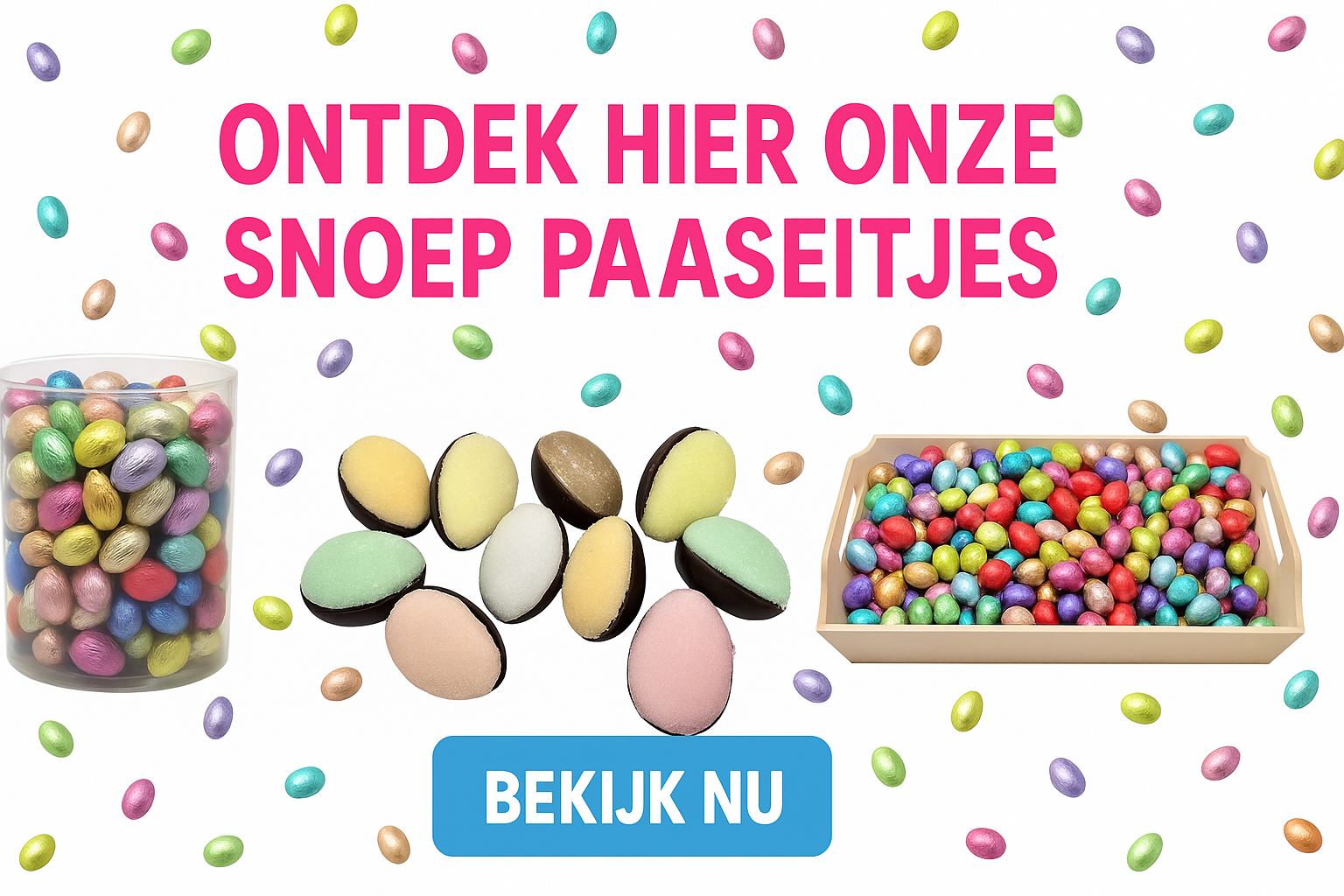 - Paaseitjes mix – een frisse mix van zoetzure snoepeitjes in verschillende kleuren en smaken. Een favoriet bij kinderen en perfect voor paaszakjes of zoektochten.
